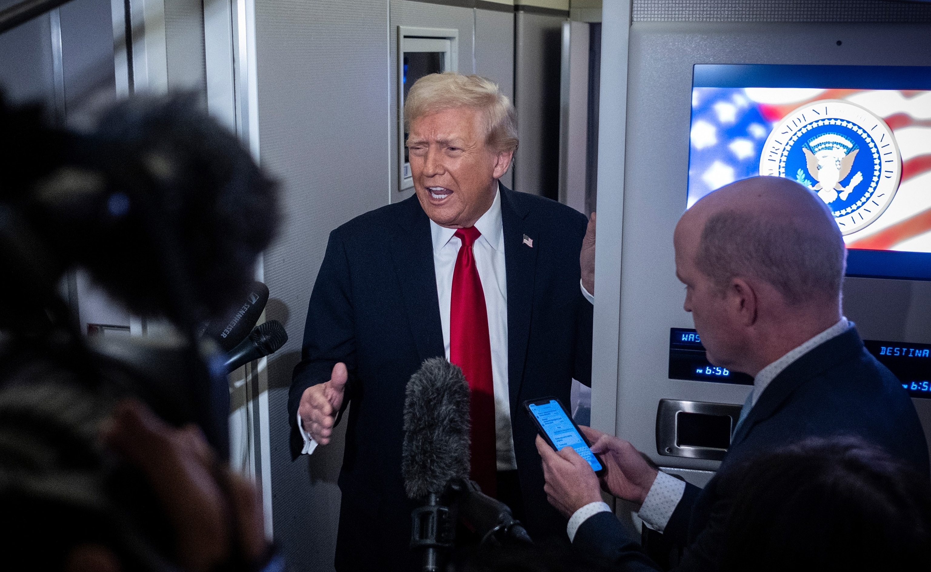 President Donald Trump speaks to the media aboard Air Force One, Nov. 25, 2025, en route to Florida.